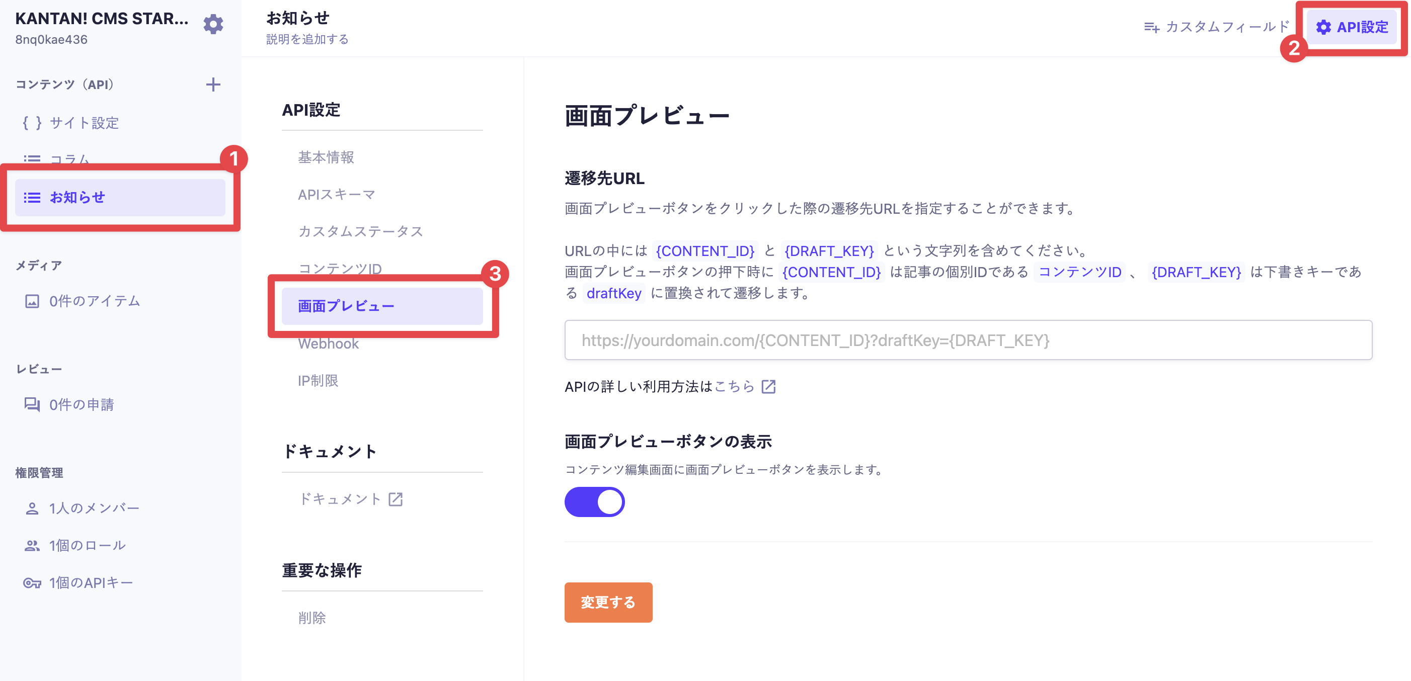 まず、左側のサイドバーから「お知らせ > API設定 > 画面プレビュー」と進みます。